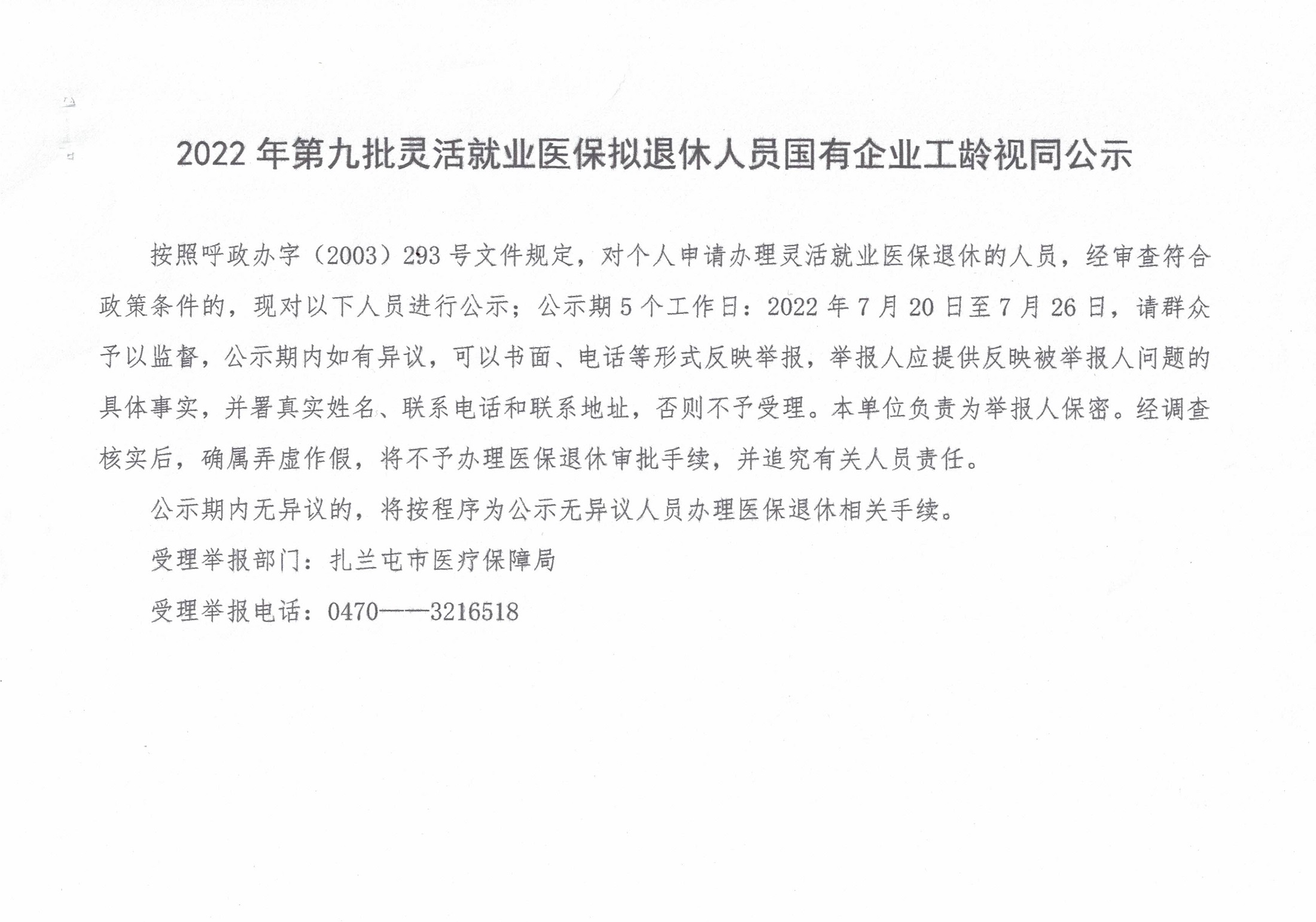 2022年第九批灵活就业医保拟退休人员国有企业工龄视同公示 |
