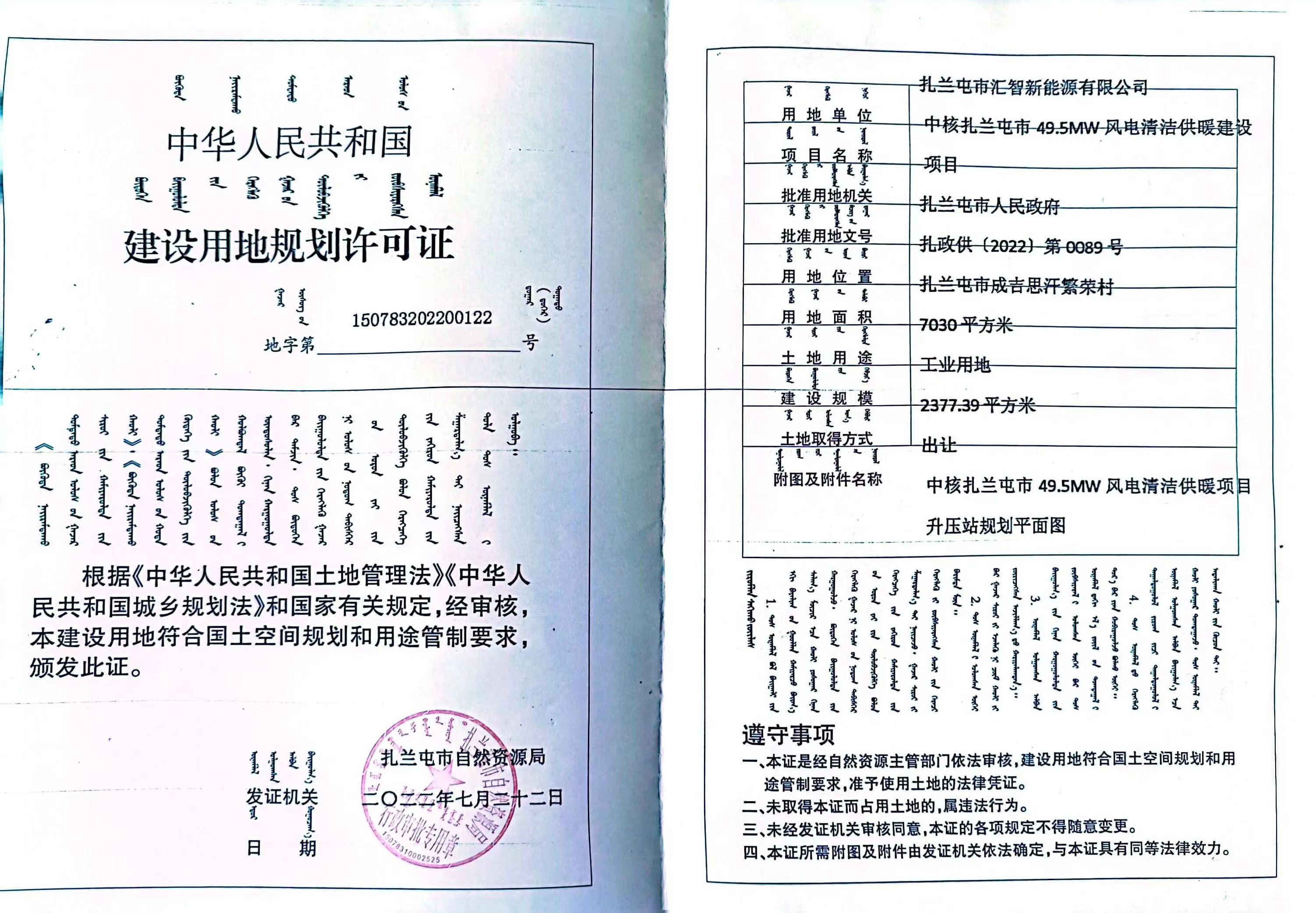 中核UedBet体育49.5MW风电清洁供暖建设项目建设用地规划许可证