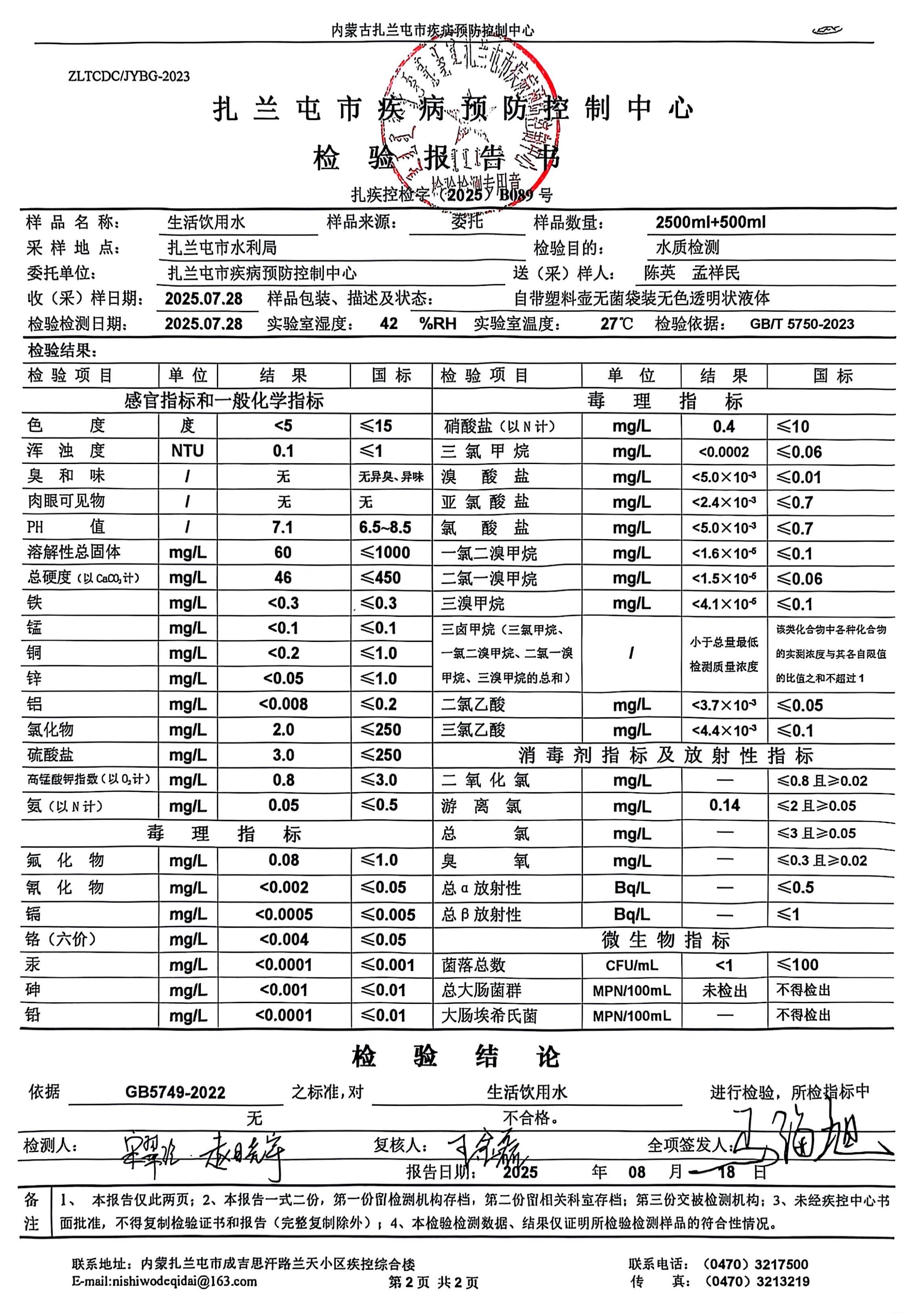 扎兰屯雅鲁供水2025年7月份检验检测报告