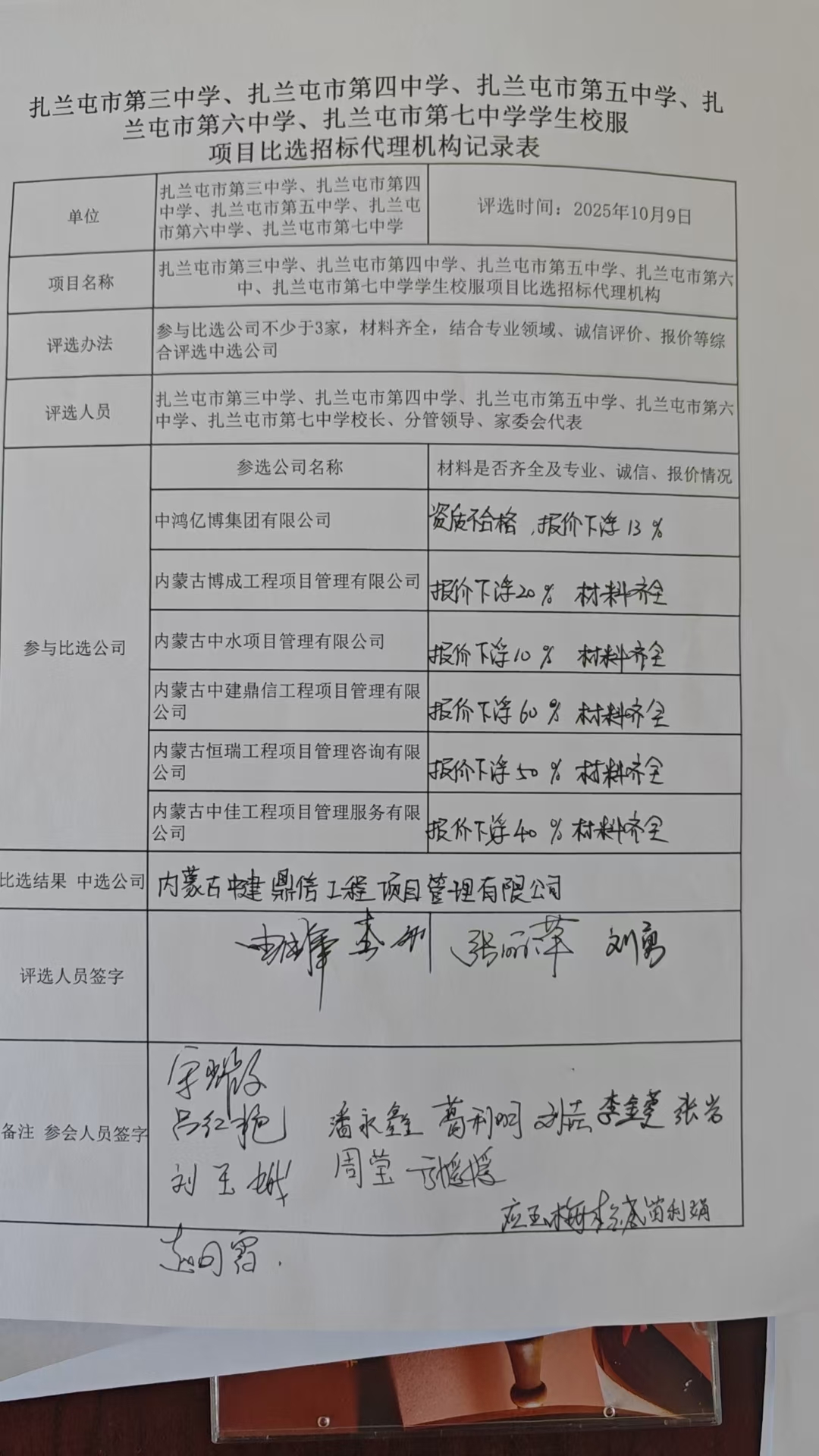 关于2025年扎兰屯市第三中学、扎兰屯市第四中学、扎兰屯市第五中学、扎兰屯市第六中学、扎兰屯市第七中学学生校服项目比选招标代理机构,依据相关法律规定,五所学校于2025年10月9日,对参与比选的“中鸿亿博集团有限公司”“内蒙古博成工程项目管理有限公司”“内蒙古中水项目管理有限公司”“内蒙古中建鼎信工程项目管理有限公司”“内蒙古恒瑞工程项目管理咨询有限公司”“内蒙古中佳工程项目管理服务有限公司”6家公司,进行了公开比选。